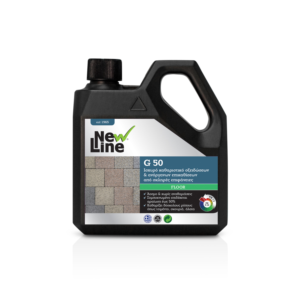 Συμπυκνωμένο ισχυρό όξινο καθαριστικό & αφαιρετικό οξειδώσεων και επικαθίσεων για επιφάνειες που έρχονται σε επαφή με το νερό όπως αγυάλιστα μάρμαρα, φυσική πέτρα, τσιμεντόπλακες, κεραμικά πλακάκια. Αναμφίβολα η κυριότερη ιδιότητα του G 50 είναι η υψηλή του συγκέντρωση που του επιτρέπει την χρήση με μεγάλες αραιώσεις. Πλήρως αποτελεσματικό στους δύσκολους και επίμονους έγχρωμους λεκέδες, όπως σκουριά συσσωρευμένα άλατα, λάσπη κ.α. Ξεχωρίζει από τα κοινά καθαριστικά λόγω της γρήγορης και αποτελεσματικής δράσης του. Στον οικοδομικό τομέα καθαρίζει τα τσιμέντα από φορτηγά, πρέσες και εξοπλισμό γενικότερα. Καθαρίζει από νεοτοποθετημένα πατώματα, υπολείμματα σοβάδων και κόλλας. Στον ναυτικό τομέα καθαρίζει την στρειδώνα από τον πυθμένα των σκαφών.